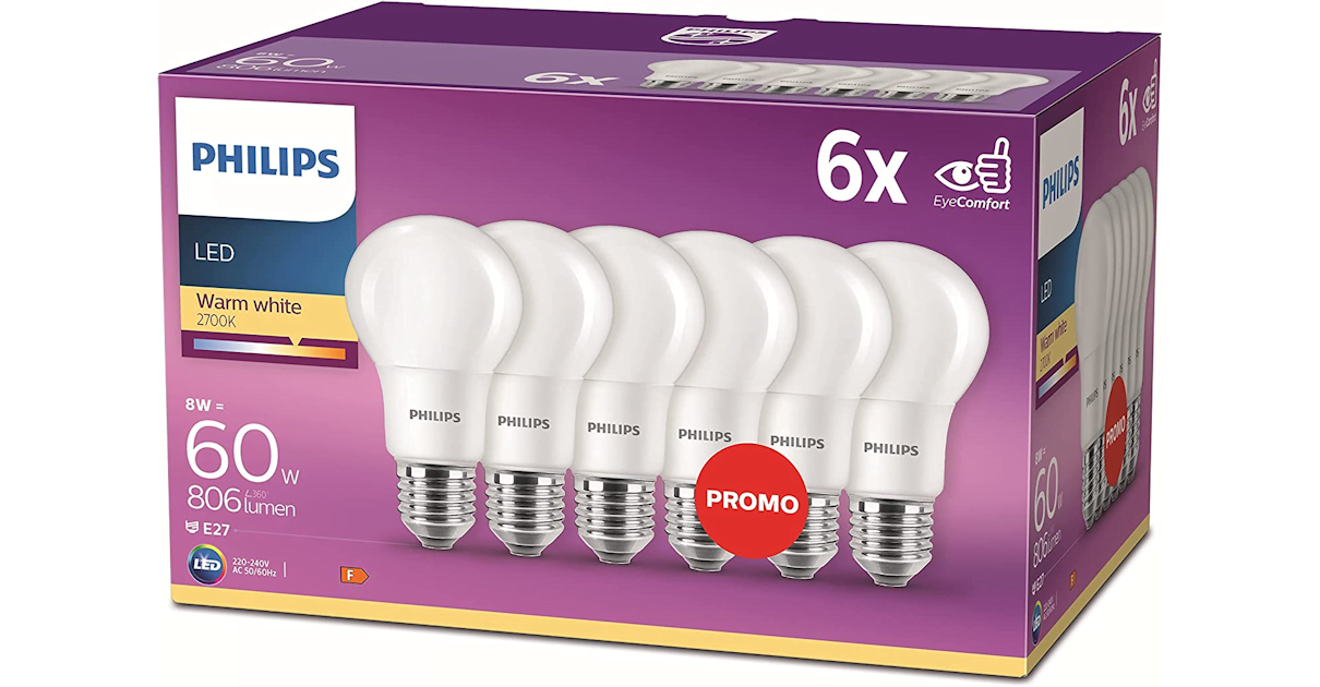 Si pasas mucho tiempo en casa, uno de los puntos en los que más puedes ahorrar a la hora de abaratar la factura de la luz, es en la iluminación, especialmente si todavía utilizas bombillas halógenas o de incandescencia. Vamos a hacer un pequeño cálculo a continuación de estas líneas para que veas la diferencia real en Euros entre mantener tus actuales bombillas o cambiarlas por este pack de 6 bombillas LED Philips de 8W que están de oferta en Amazon y PCComponentes a solo 11,72€.