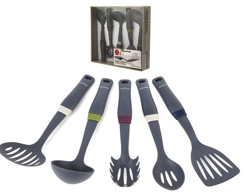 El conjunto está formado por 1 espátula, 1 cucharón sólido, 1 cucharón, 1 cucharón para la pasta y 1 espumadera, fabricados en nylon, resistentes al calor, por supuesto, y si te fijas en más fotos que tiene Amazon, podrás comprobar que su forma hace que la cabeza de estas herramientas de cocina, una vez las pones en la encimera, no toca, si no que está sólo apoyada sobre el mango.