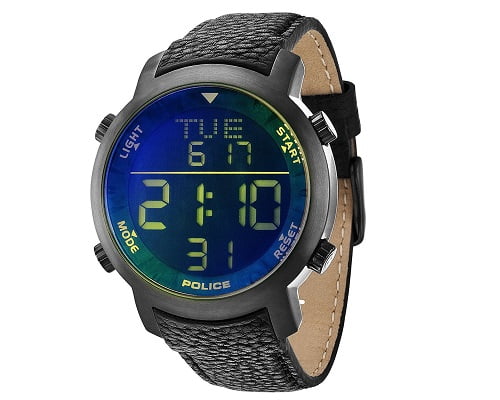 Este reloj marca Police, tiene una caja de acero inoxidable, en la cual presenta un mecanismo de cuarzo digital fabricado por Miyota, y la cual está revestida con una capa de color, tiene un diámetro de 46mm y con correa de piel. revestido con capa de color con un diámetro de 46 mm y cuenta con una correa de piel.